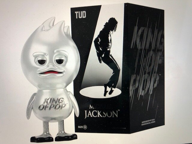 Именно в таком виде компания The Ugly Duck (или сокращённо TUD) решила представить «Короля поп-музыки». Фирма эта известна производством коллекционных дизайнерских арт-игрушек, и новая игрушка под названием TUD х Michael Jackson продолжает предыдущие «утиные» выпуски компании. В аннотации говорится, что «коллаборация была вдохновлена стилем и музыкой короля поп-музыки». Действительно, дизайнеры, занятые разработкой игрушки, использовали узнаваемые детали образа Джексона (Michael Jackson), при этом удачно «вписав» новый объект в линейку образов TUD. Игрушка имеет высоту 60 см и вес 3.5 кг. Колористическое решение минималистично – белое и чёрное, - что явно отсылает зрителя к одному из хитов артиста “Black or White”, однако язычок у утёнка всё же красный. Правое крыло и лапы игрушки покрыты блёстками, напоминая об известных «визуальных маяках» артиста - знаменитой перчатке со стразами и белых приспущенных носках. Компания TUD также рекомендует обратить внимание на звездное небо на спине,
