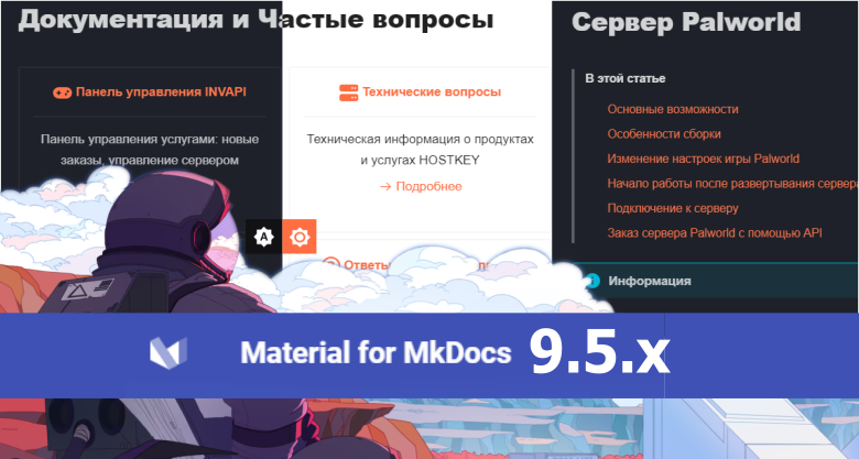 В декабре 23-го года Material for MkDocs обновился до версии 9.5, но из-за регрессов переходить на него не решились (и, судя по изменениям, не стоило еще месяц назад). Но сейчас версия уже достаточно стабильная и поправленная, поэтому можно решиться перейти на ветку 9.5.x. На момент написания данного текста релизной является версия 9.5.13.