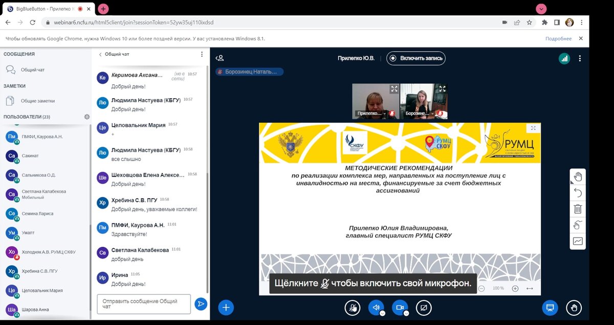 14 марта 2024 года сотрудники Ресурсного учебно-методического центра по обучению лиц с инвалидностью и ОВЗ СКФУ провели вебинар на тему «О реализации комплекса мер по содействию в поступлении на обучение лиц с инвалидностью на места, финансируемые за счет бюджетных ассигнований». В вебинаре приняли участие представители вузов-партнеров РУМЦ, представители приемных комиссий вузов-партнеров. Целью вебинара явилось обсуждение цикла мероприятий по реализации комплекса мер по содействию в поступлении на обучение лиц с инвалидностью на места, финансируемые за счет бюджетных ассигнований. Спикер вебинара Борозинец Наталья Михайловна, директор РУМЦ, заведующий кафедрой коррекционной психологии и педагогики ФГАОУ ВО «Северо-Кавказский федеральный университет» осветила перечень приоритетных мероприятий по повышению доступности и качества высшего образования для студентов с инвалидностью на 2024 год, которые необходимо организовать и провести в рамках взаимодействия с вузами-партнерами. Спикер ве