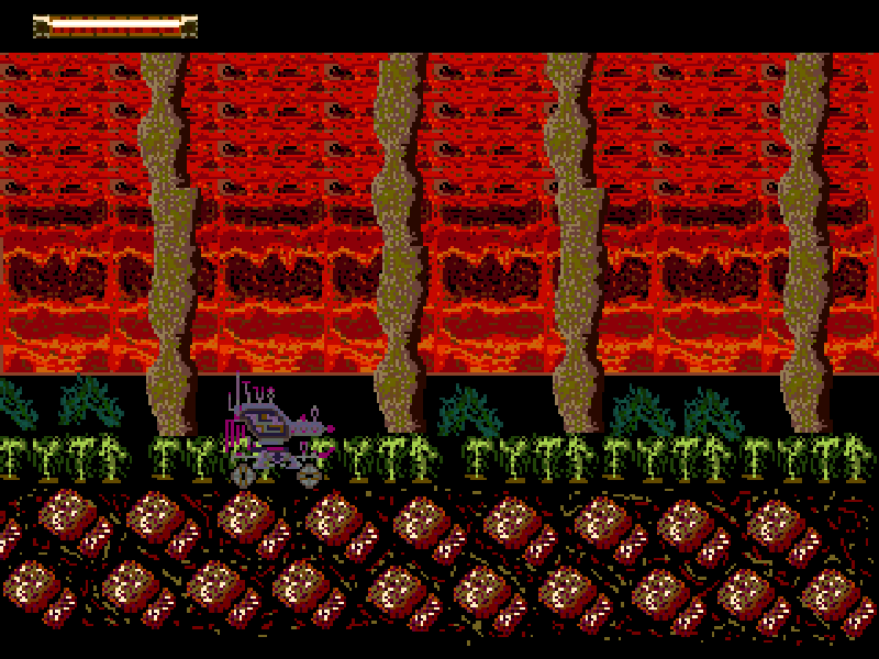 Пиксель арт на сегодня по мотивам видеоигры Blaster Master 2 для игровой приставки Super Nintendo. Очень красочная графика. Супер Нинтенда на то и супер, что там очень красивая графика как правило. А, игрушка Бластер Мастер еще по денди известная. Сам правда не играл. Какая-то тема фантастики, приключения и боевика. А это мой рисунок на подобную тему. Ты управляешь исследовательским экипажем. Исследуется планета в созвездии Лебедя. Удивительно, но планета даже похожа на планету Земля. Планета имеет огромные деревья. И много мелкой зелени. Трава тут по пояс и выше. Поверхность каменистая. Крупные валуны повсюду. И небо красноватого цвета. Абсолютно всегда. И днем и на закате. Ночью только становится темно красным. Почти черным. Удивительно зрелище - увидеть другие планеты. Экипаж имеет большие колеса. И огромную автоматическую пушку на всякий случай. На нем установлено много антенн. Как для связи. Так и для измерения всякого изучения. Поиск излучения. Всевозможных диапазонов. Планета по