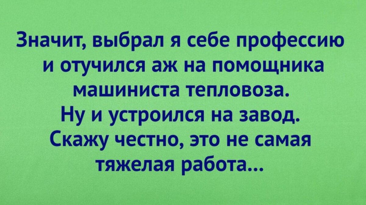 Значит, выбрал я себе профессию и отучился аж на помощника машиниста тепловоза. Ну и устроился на завод. Скажу честно, это не самая тяжелая работа. Приходишь на работу, и всё, что от меня требуется, это всю смену кататься на тепловозе. Когда стоим, спим, а когда едем, смотрю в окно и плюю на прохожих. Ну и иногда сообщаю машинисту, какой светофор горит и нет ли препятствий на пути. Ну, думаю, да, это мне подходит. Кататься и получать за это деньги то, что надо. Но в один прекрасный день весь этот рай закончился. Меня пересадили на другой тепловоз к другому машинисту. Начнем с того, что от него всегда воняло тухлой рыбой. И чтоб не задохнуться в маленькой кабине, мне приходилось всё время ездить с высунутой головой. И в дождь, и в снег, и даже когда птицы какали на лицо. И вот, когда мы с ним заступили на ночную смену, он мне и заявляет. – "Значит так, сынок. Работать будем так. Полночи рулю я, и ты спишь, ну а вторую половину наоборот. Я сплю, а ты управляешь." Ничего себе! Ну, думаю,
