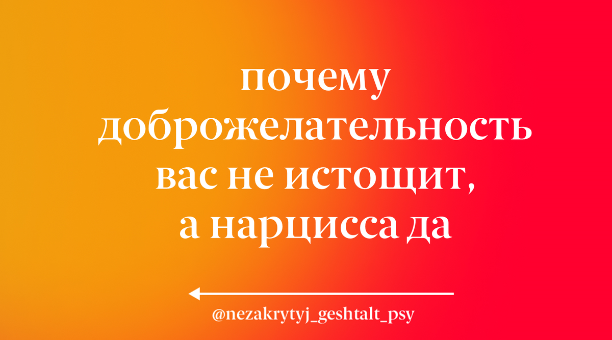 А вот нарциссы считают, что доброжелательность истощает. Что она может повредить. Что она сама представляет угрозу. Ага, для нарциссов все, что ими не прочувствовано в целом представляет угрозу.