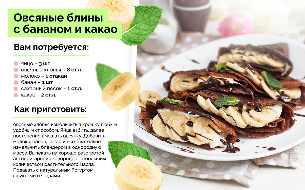 Овсяной может быть не только каша! Мы вам это докажем, ведь сегодня специально для «Московского здоровья» - овсяные блины с бананом и какао!