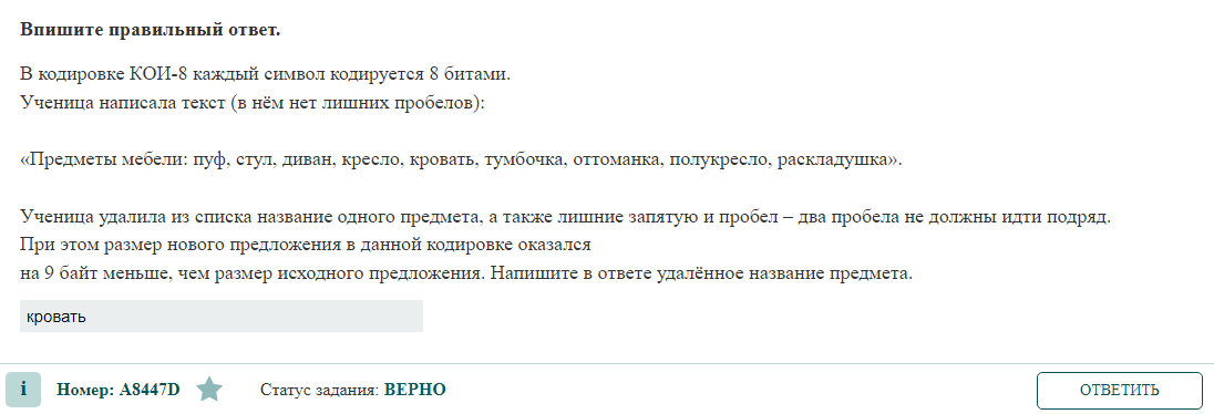 В кодировке КОИ-8 каждый символ кодируется 8 битами. Ученица написала текст (в нём нет лишних пробелов): «Предметы мебели: пуф, стул, диван, кресло, кровать, тумбочка, оттоманка, полукресло, раскладушка». Ученица удалила из списка название одного предмета, а также лишние запятую и пробел – два пробела не должны идти подряд. При этом размер нового предложения в данной кодировке оказался