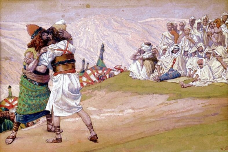 "Взглянул Иаков и увидел: и вот идет Исав и с ним четыреста человек. И разделил Иаков детей Лии, Рахили и двух служанок. И поставил служанок и детей их впереди, Лию и детей ее за ними, а Рахиль и Иосифа позади. А сам пошел пред ними и поклонился до земли семь раз, подходя к брату своему. И побежал Исав к нему навстречу, и обнял его, и пал на шею его, и целовал его, и плакали оба. И взглянул Исав, и увидел женщин и детей, и сказал: «Кто это у тебя?» Иаков сказал: «Дети, которых Бог даровал рабу твоему». И подошли служанки и дети их и поклонились; подошли и Лия и дети ее и поклонились; наконец подошли Иосиф и Рахиль и поклонились. И сказал Исав: «Для чего у тебя это множество, которое я встретил?» И сказал Иаков: «Дабы приобрести благоволение в очах господина моего». Исав сказал: «У меня много, брат мой, пусть будет твое у тебя». Иаков сказал: «Нет, если я приобрел благоволение в очах твоих, прими дар мой от руки моей, ибо я увидел лицо твое, как бы кто увидел лицо Божие, и ты был благосклонен ко мне; прими благословение мое, которое я принес тебе, потому что Бог даровал мне и есть у меня всё». И упросил его, и тот взял и сказал: «Поднимемся и пойдем, и я пойду пред тобою». Иаков сказал ему: «Господин мой знает, что дети нежны, а мелкий и крупный скот у меня дойный; если погнать его один день, то помрет весь скот; пусть господин мой пойдет впереди раба своего, а я пойду медленно, как пойдет скот, который предо мною, и как пойдут дети, и приду к господину моему в Сеир». Исав сказал: «Оставлю я с тобою некоторых из людей, которые при мне». Иаков сказал: «К чему это? Только бы мне приобрести благоволение в очах господина моего!» И возвратился Исав в тот же день путем своим в Сеир. А Иаков двинулся в Сокхоф, и построил себе дом, и для скота своего сделал шалаши. От этого он нарек имя месту Сокхоф" (Быт. 33:1-17).