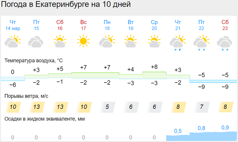 В пятницу, 15 марта, в Свердловской области ожидаются сильные порывы ветра до 23 м/с. В региональном МЧС дали рекомендации, как вести себя при сильном ветре: В ближайшие дни в Екатеринбурге потеплеет, следует из прогноза «Гисметео».