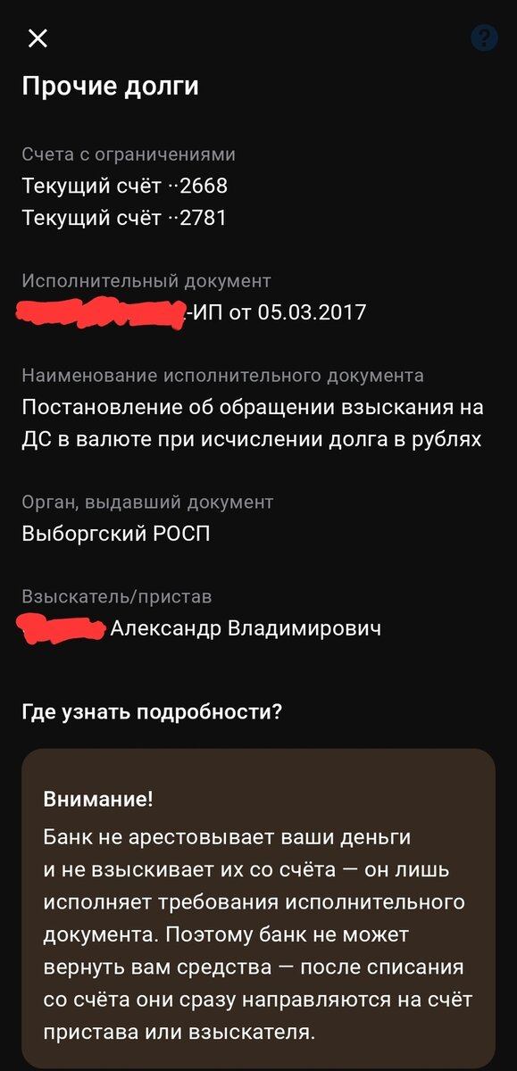 Была "веселая ситуация" лет 6 назад. Звоню в Альфа-банк, чтобы разобраться: Я: Добрый день! У меня списали деньги с рублевого счета за оплаченный ранее штраф (я его оплатил в тот же день, что и получил, но с карты сбера). Понимаю, что возвращать их - только нервы тратить. Но у меня почему-то на валютных счетах минус на эту сумму по курсу. ТП: Да, мы получили исполнительный лист на штраф 500р и списали их с рублевого счета, но на валютных счетах не было необходимой суммы, потому минус. Я: Я верно понимаю, что исполнительный лист был на 500р, вы их сняли с рублевого счета, а также увели в минус на эту сумму два валютных счета? ТП: Да, верно, у нас исполнительный лист. Я: Девушка, вас не смущает, что Вы УЖЕ сняли эти 500 рублей с одного счета и хотите, чтобы я еще дважды его оплатил с валютных счетов? ТП: У нас исполнительный лист, по которому у вас долг. Я: Да! И Вы списали эту сумму с рублевого счета. 500 рублей вы должны были списать и Вы их списали. Почему же я еще должен что-то оплач