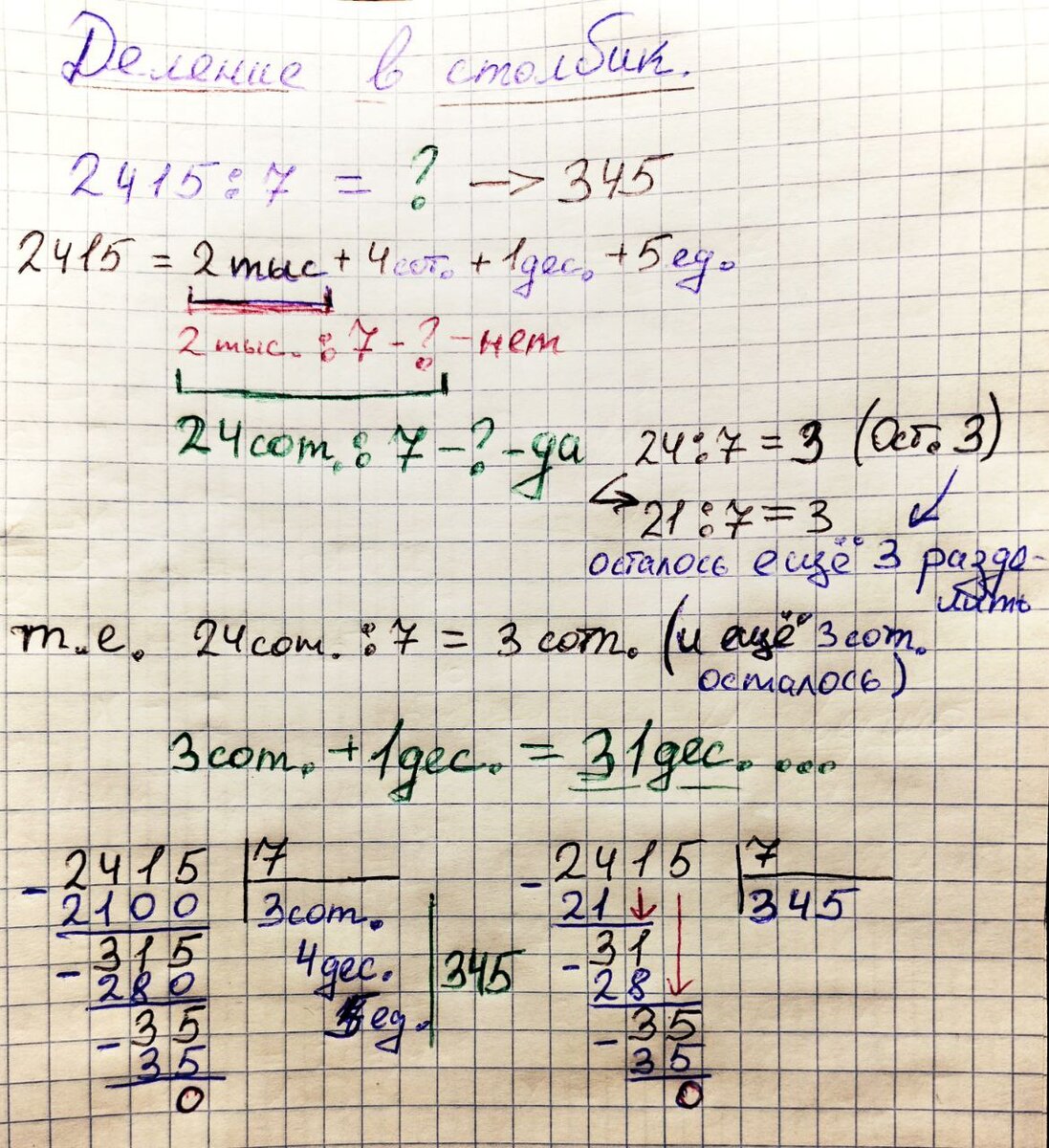 Надо разделить число 2415 на 7. Простое деление в столбик на однозначное число (3 класс современной школы).