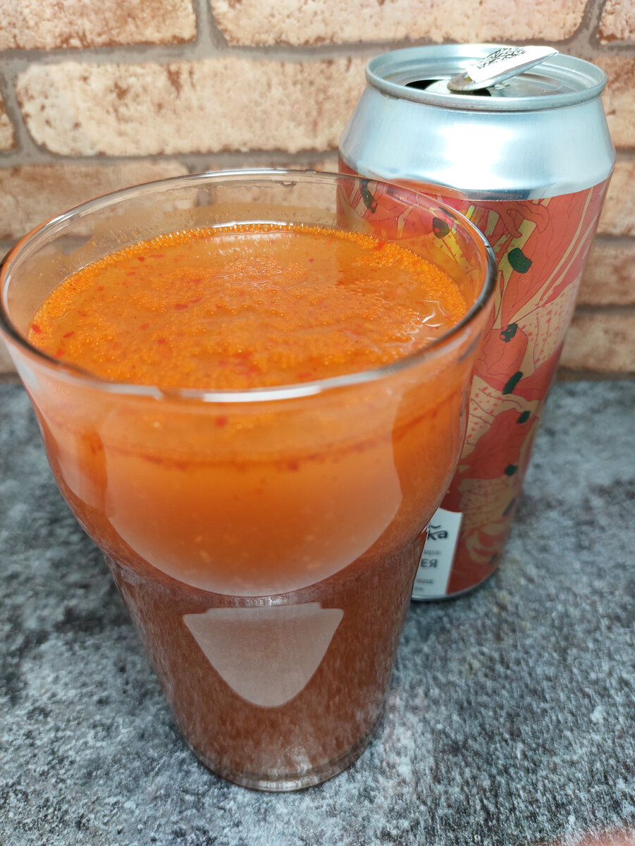 Гозе со вкусом Кимчи от Alaska Brewery (ООО "Аляска"), г. Балашиха Московской области. Описание напитка на UNTAPPD: "Блюдо корейской кухни представляет собой остро приправленные квашеные овощи, в первую очередь, пекинскую капусту. Журнал Health включил кимчхи в список «Самая здоровая еда в мире». Красный перец, завезённый в Корею португальцами, стали добавлять в блюдо уже после XVI века. Сейчас красный жгучий перец является одним из важнейших ингредиентов большинства разновидностей кимчхи." Плотность: 16.8%. Состав: вода подготовленная, солод ячменный, солод пшеничный светлый, томатная паста, паста кимчи, сок лайма концентрированнй, соль, хмель гранулированный, дрожжи пивные. Срок годности 24 месяца при температуре от +2℃ до +5℃. С даты розлива моей банки прошло менее 2х месяцев. Пены в принципе не было. Во время налива бросается в глаза огромное количество разного рода осадка. Что-то осело на дно, что-то продолжило плавать, а что-то всплыло на поверхность. В общем выглядит так себе.