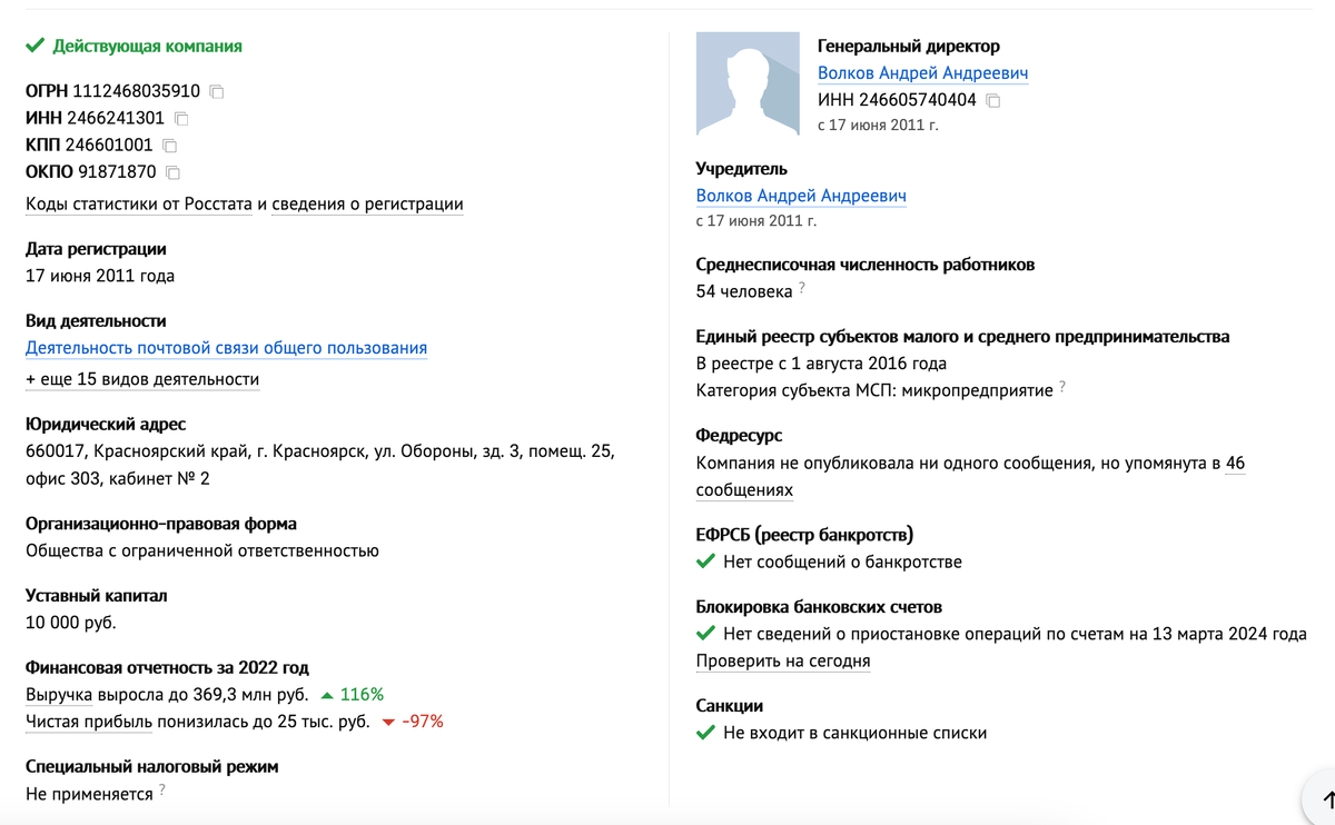 Я изучил подробнее информацию из открытых источников об их ООО-щке, которая называется ООО ГК Иксмейл. И многое у меня тоже вызвало сомнения. Например то, что есть две компании с абсолютно одинаковыми названиями ООО ГК Иксмейл, с абсолютно одинаковыми услугами, обе находятся в Красноярске, но принадлежат разным людям с одинаковой фамилией. Волкова Татьяна и Волков Андрей. Если я правильно понимаю, это муж и жена.