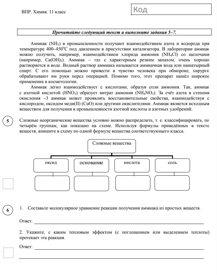 Ответы и задание будут у нас в Телеграмме👇🏻 ВПР. Химия. 11 класс 5 Прочитайте следующий текст и выполните задания 5-7. Аммиак (Н3) в промышленности получают взаимодействием азота и водорода при температуре 400-450°С под давлением в присутствии катализатора. В лаборатории аммиак можно получить, например, взаимодействием хлорида аммония (NH4Cl) со щелочами (например, Са(ОН)2). Аммиак газ с характерным резким запахом, очень хорошо растворяется в воде. Водный раствор аммиака называется аммиачная вода или нашатырный спирт. С его помощью можно привести в чувство человека при обмороке, хирурги обрабатывают им руки перед операцией. Помимо того, этот препарат нашёл широкое применение в косметологии. Аммиак легко взаимодействует с кислотами, образуя соли аммония. Так, аммиак с азотной кислотой (HNO3) образует нитрат аммония (NH4NO3). За счёт азота в степени окисления -3 аммиак может проявлять восстановительные свойства, взаимодействуя с кислородом, оксидом меди(II) (CuO) или другими окислител