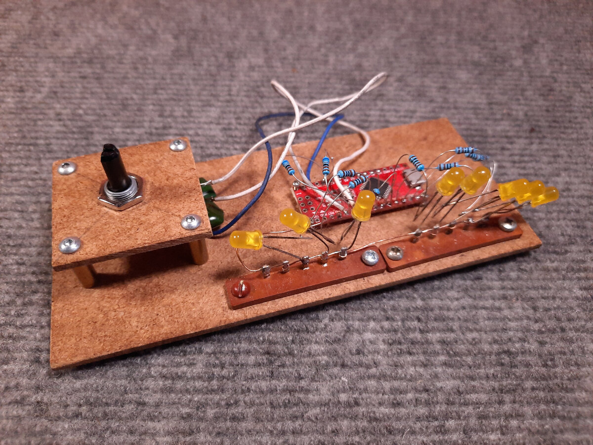 Приветствую на канале. Сегодня в выпуске я покажу решение для реализации вывода и регулировки энкодером двоичного восьмибитного числа от 0 до 255-ти на Arduino. Итак, для удобного использования и отладки кода, на коленке был быстро собран вот такой макет. Плата Arduino nano на контроллере Atmega 168. Схема данного изделия выглядит следующим образом. Числа выводятся светодиодами в количестве 8-ми штук. При включении платы ни один светодиод не горит. При вращении энкодера по часовой стрелке число с каждым тиком увеличивается на единицу, процесс идет пока не будет достигнуто число 255. При вращении энкодера против часовой стрелки, число уменьшается, пока не будет достигнут 0. Прошивка выглядит следующим образом, работает самостоятельно без помощи библиотек. Нужно отметить, что программа отлично отрабатывает дребезг контактов, и работает с плохим энкодером без цепей устраняющих дребезг. Но RC цепи устранения дребезга всё же лучше поставить. Диапазон регулировки чисел можно поменять значени