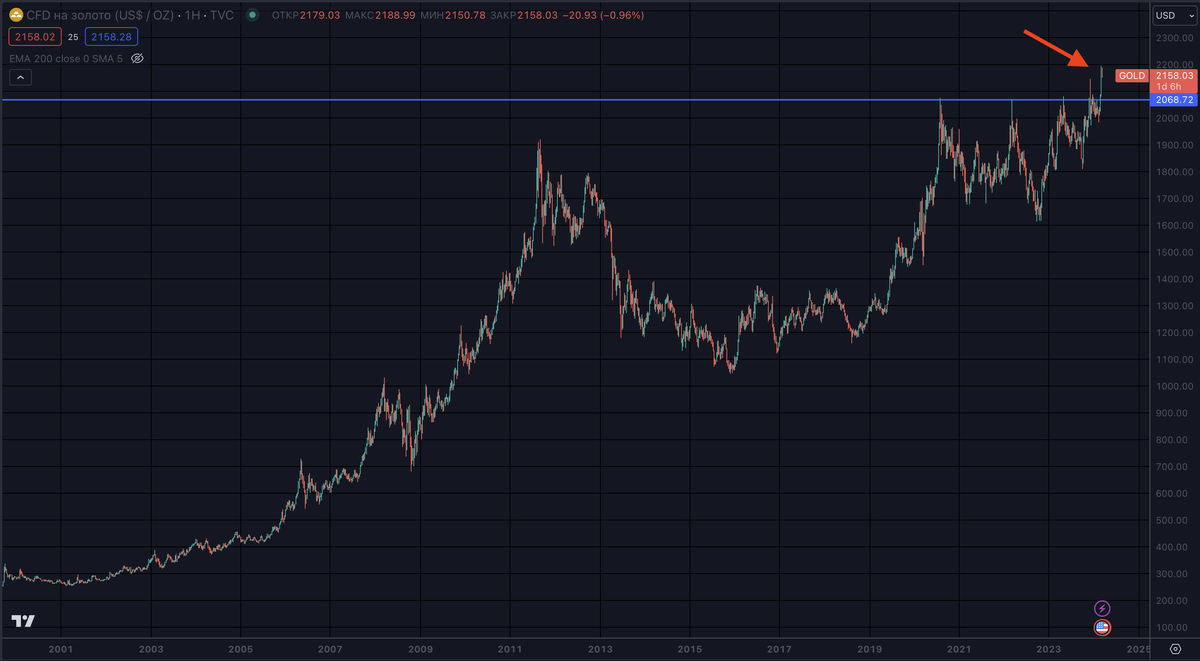 В марте цена на золото уверенно вырвалась за пределы своего исторического максимума и сейчас составляет порядка $2150. Вот наглядный скрин: