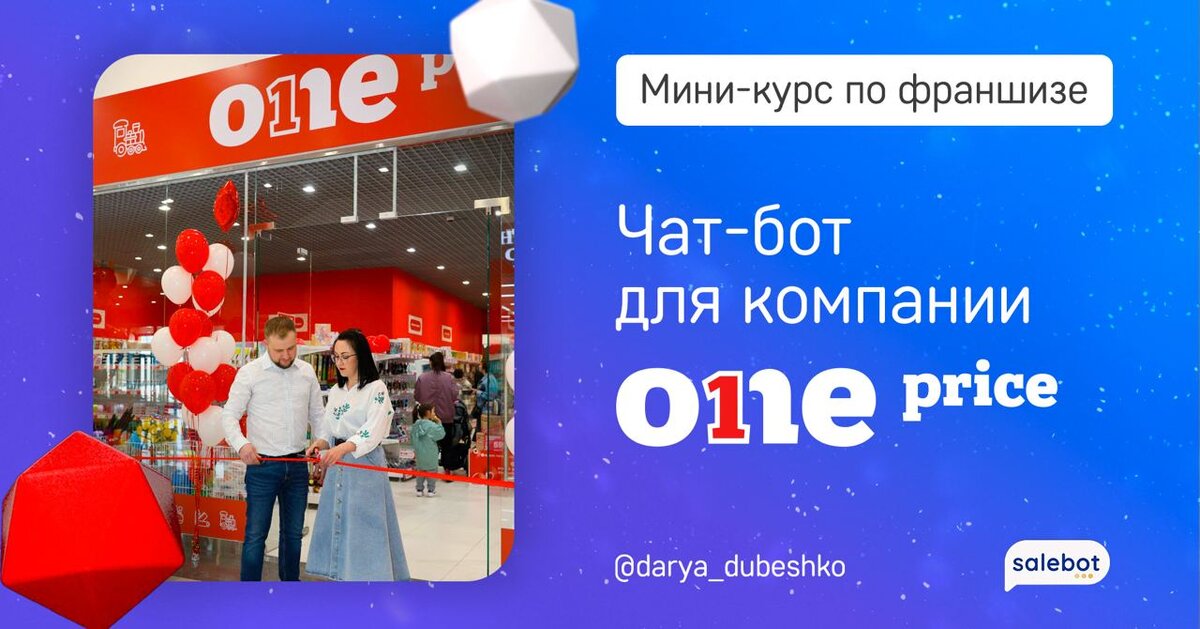 Открытие бизнеса по франшизе становится всё более популярным в России. По данными статистики, число заявок на создание франшиз увеличилось на 25%. Исходя из этих показателей, и заказчиков по чат-ботам становится всё больше. Как раз недавно мы закончили ещё один проект в нише франчайзинга, его результатами с удовольствием делюсь. One Price - федеральная сеть магазинов товаров фиксированной цены. В продаже есть всё необходимое для дома и отдыха. 80% ассортимента - непродовольственные товары повседневного спроса, обеспечивающие стабильные продажи круглый год. Уже открыто более 100 торговых точек, охват более 60 городов. За последний год прирост числа открытых магазинов составил более 200%. У данного чат-бота есть 2 направления: Что касается первого пункта, благодаря чат-боту получился налаженный процесс работы с потенциальными партнерами на первоначальном этапе: Мини-курс «Открыть свой бизнес VS Купить франшизу» состоит из 3 блоков: Например, можно узнать стоимость привлечения специалист