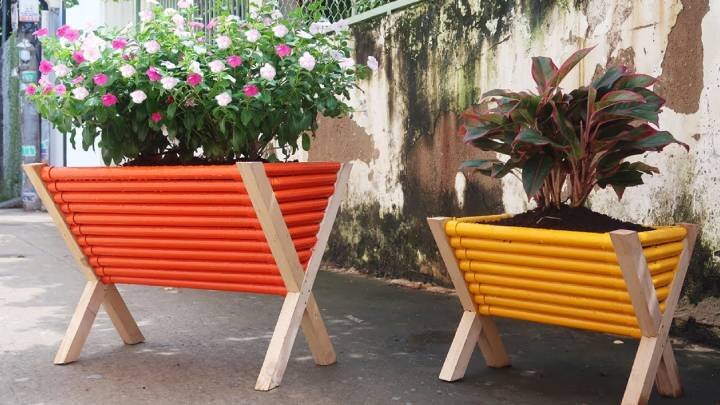 Из брусков и труб ПВХ соберите оригинальную, красивую, практичную вещь для участка! Это вместительный, необычный вазон, для создания которого не нужен цемент. Простая работа с отличным результатом! Собрать такой вазон по силам каждому человеку. Материалы и инструменты: Ножки из брусков Возьмите 4 бруска одинакового размера. Расчертите каждый чуть ниже середины, выпилите углубление наполовину. Вставьте один брусок во второй. Зафиксируйте гвоздями. Ножки подпилите, чтобы они плотно стояли на полу. Для 1 вазона понадобится 2 такие заготовки. Стенки из ПВХ труб Распилите ПВХ трубы на детали длиной 50 см. Эта величина опциональна и может быть изменена согласно вашим предпочтениям. На большей половине брусков закрепите заглушки для труб. Используйте саморезы и шуруповерт. Вставьте одну часть в другую. Получится основание вазона! Теперь закройте боковые стенки. Для этого распилите ПВХ трубы на небольшие детали, согласно размерам, и зафиксируйте на саморезы. Декор и результат Покрасьте поделку