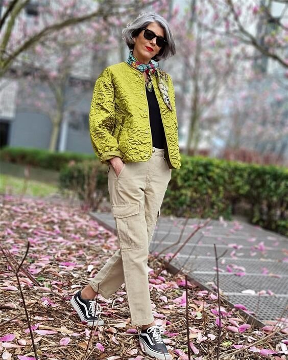- Удобный комплект для прогулок. В ансамбль входят светлые брюки-карго из плотной хлопковой ткани черная футболка и необычная куртка-жакет их фактурной ткани оливкового цвета. Образ дополняют черные кроссовки с белыми вставками.