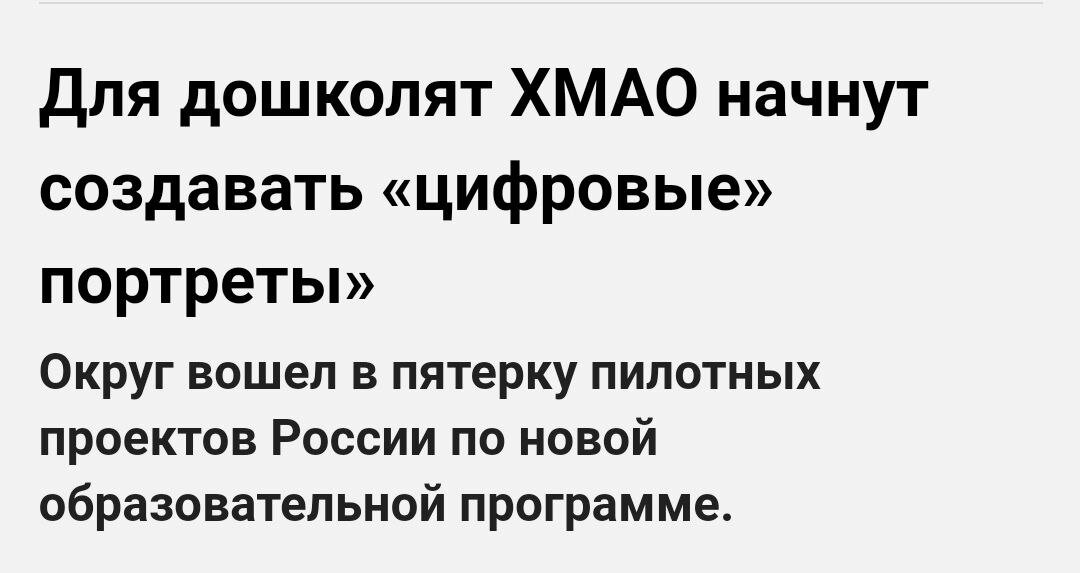 Ханты-Мансийский автономный округ вошел в пятерку пилотных регионов РФ, в которых начнут внедрять «цифровой» портрет ребенка в образование и в здравоохранение в качестве эксперимента В рамках этих проектов родители дошколят получат профессиональную оценку развития своих детей. "Будет составлен «цифровой» портрет по 15 ключевым направлениям: интеллектуальному, психоэмоциональному, физическому и другим», — рассказала замдиректора Департамента образования и науки ХМАО. 😡В физических параметрах ребёнка будет учитываться буквально все: температура тела, аппетит, результаты анализов и календарь прививок. Как утверждают авторы цифрового проекта, цифровой портрет поможет к моменту поступления в школу сформировать первокласснику портфолио, чтобы педагоги смогли активно пользоваться им для дальнейшего контроля и успешного развития ребенка. (С каких пор педагоги контролируют и развивают наших детей?) Несмотря на то, что более 50% россиян считают цифровое портфолио ненадежным, небезопасным