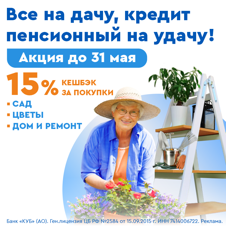 Открываем сезон выгодных кредитов! При оформлении кредита «КУБ-Пенсионный» вы получите в подарок 15% кешбэка за покупки для дачи!