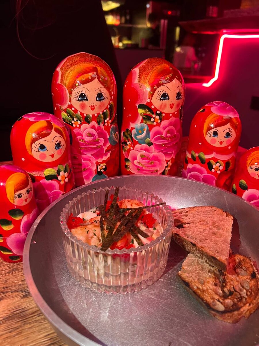 наш выбор: на закуску взяли сладковатый хумус из каштана (650 ₽) и сушки с трюфелем (530 ₽) — вариация фондю на русский манер 🥗 Оливье от Машеньки (650 ₽) с креветками и соусом понзу и севиче из лосося (790 ₽) порадовали качеством рыбы и насыщенным вкусом! 😋
