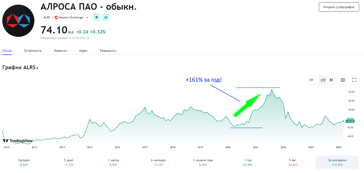Например, за период с апреля 2020 по сентябрь 2021 котировки акций АЛРОСы показали впечатляющий рост на +161% на фоне высоких финансовых и операционных показателях. А по итогам 2022 компания стала лидером по добыче алмазов во всем мире! Но, с наложением на компанию санкций из-за СВО, бриллиант АЛРОСЫ стал тускнеть. Котировки акций алмазодобытчика снизились в 3 раза, а сами акции компании были исключили из индекса "голубых фишек" (IMOEXBC).