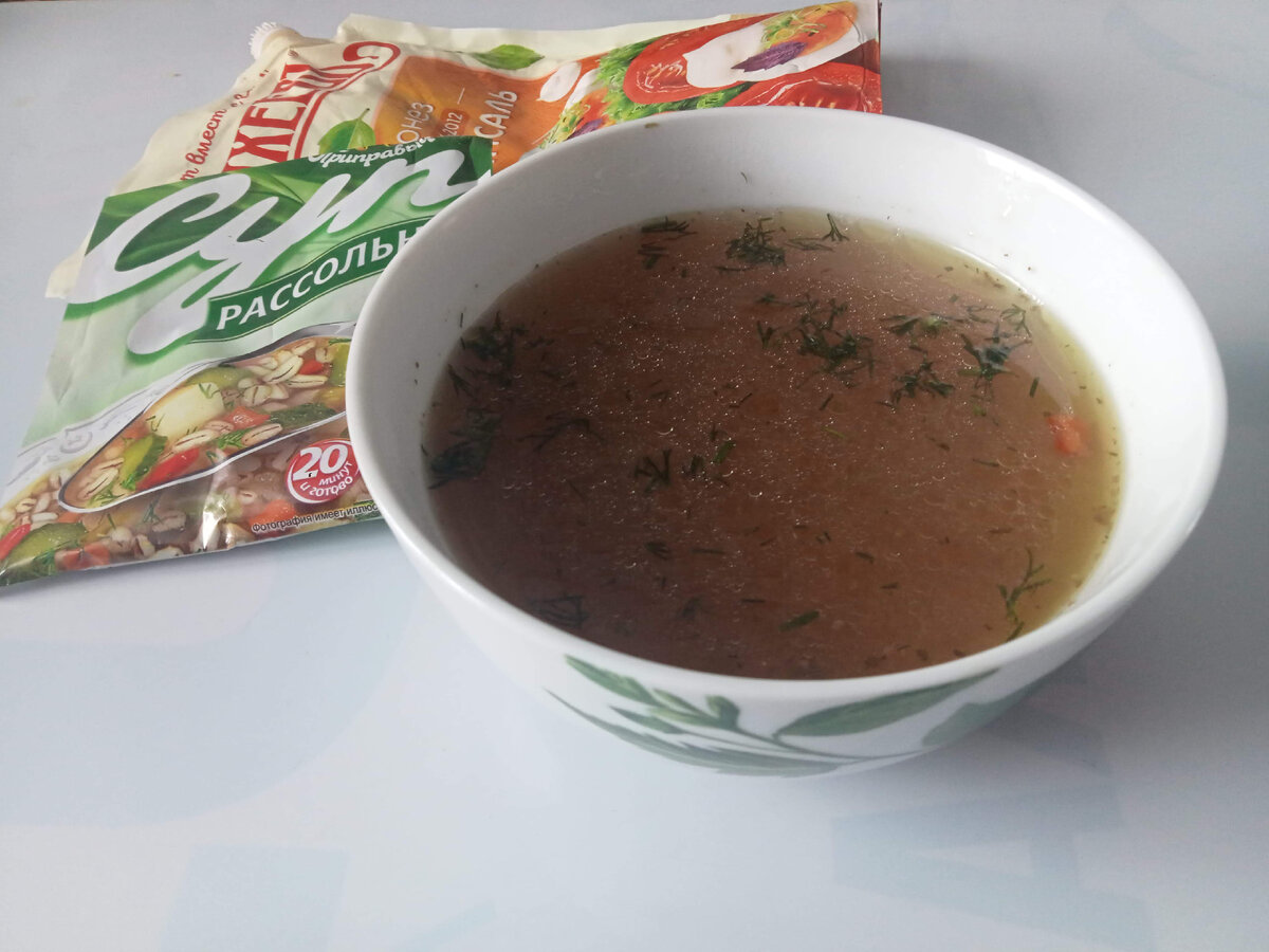 В бульон тоже насыпала пачку купленного рассольника. Почему бы и нет? Мне хватило на два дня при условии, что конечно это не то, что сварено как положено.