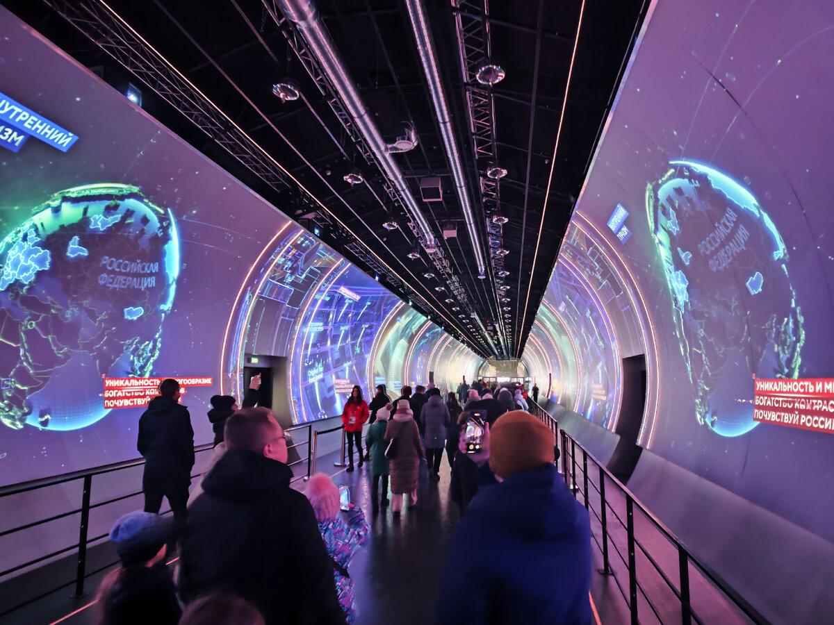 Удивительно, но в это «кишку» после входа на выставку, а именно ее она напоминает издалека, существует еще и очередь. Это только Владимиру Путину повезло, для него даже расчистили эту трубу от людей. Как, кстати, в этом году будет проходить инаугурация? Опять в пустом городе?
