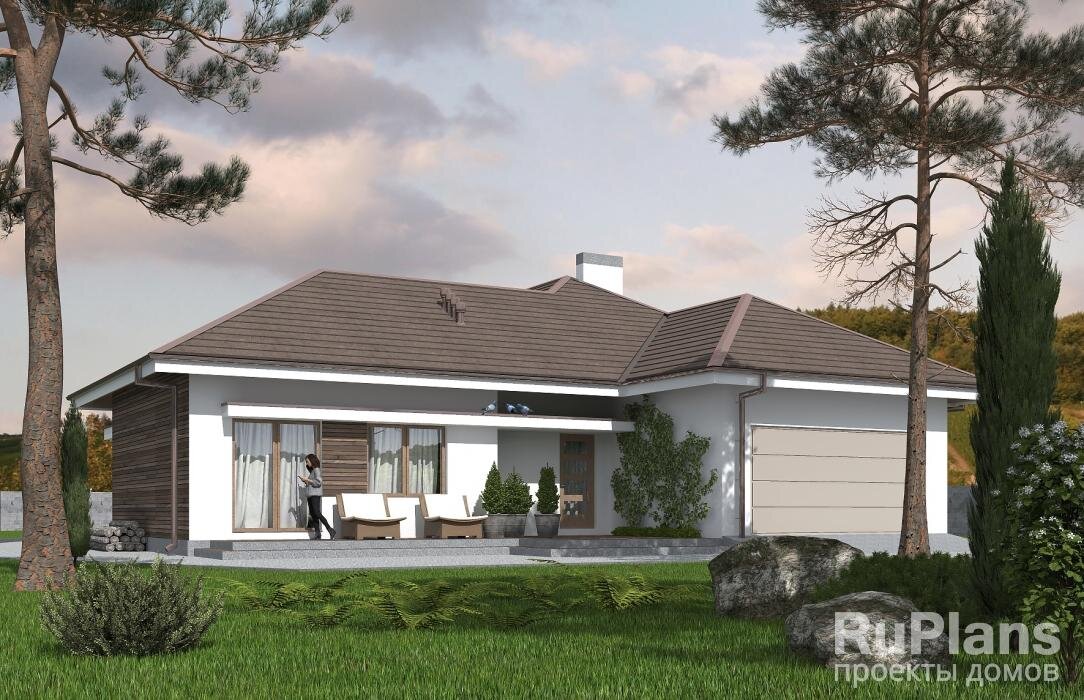 Одноэтажный дом с террасами и гаражом, с размерами здания 16,49 х 16,77 м. Наружная отделка здания – штукатурка, деревянный планкен. Фундамент – монолитная ж/б плита на поверхности грунта. Наружные стены – газобетонный блок. Внутренние стены – газобетонный блок. Перегородки – газобетонный блок. Пол этажа – по монолитной ж/б плите. Чердачное перекрытие - деревянные балки. Крыша - многоскатная, с покрытием битумной черепицей. Окна — металлопластиковые. Второй бумажный экземпляр проекта в формате А3 предоставляется — бесплатно.