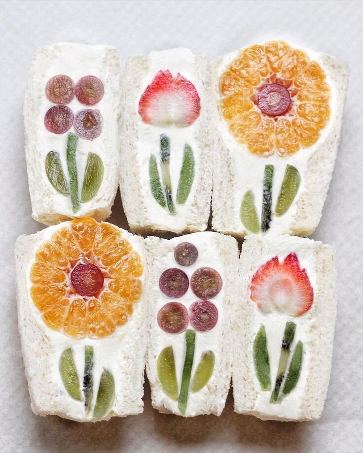 Сегодня мы приготовим популярный японский сэндвич с фруктами.(получается 1 бутерброд) P.S. - Можно сделать с любыми фруктами, какие вам только нравятся. -Ингредиенты: 🍞2 ломтика нарезанного хлеба 🍊1 мандарин (очищенный от кожуры) 🥝1 ломтик киви 🍇3 зеленых виноградины 🥛1/2 стакана жирных сливок 🧂1 ст.л. сахара (добавьте по желанию) -Инструкция: ✿1. Взбейте с помощью миксера сливки и сахар до мягких пиков ✿2. Очистите мандарин от кожуры, разрежьте и положите в середину зеленую виноградину. ✿3. Срежьте с хлеба корочки. ✿4. Выложите бутерброд на пищевую пленку и выложите слой взбитых сливок поверх первого ломтика хлеба. ✿5. Затем добавьте мандарин, зеленый виноград и ломтик киви, и еще взбитых сливок между каждым слоем. ✿6. Плотно оберните сэндвич пищевой пленкой и поставьте в холодильник на 30-45 минут. ✿7. Разверните сэндвич, разрежьте его посередине и сразу подавайте. Приятного аппетита! ✨
