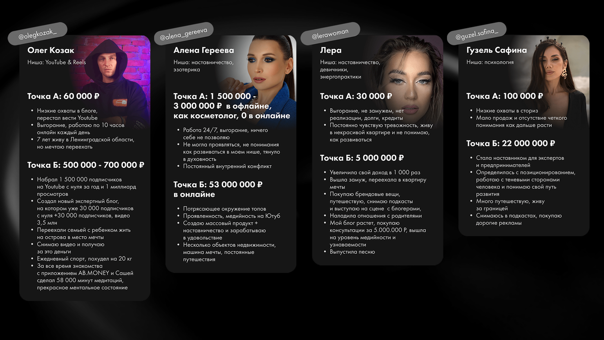 Именно такое комбо и даёт участникам продукта такие масштабные результаты: 1,5 миллионов подписчиков на YouTube, х10 рост в доходе, создание узнаваемого оффлайн-бизнеса, яркость жизни, спикерство на масштабных конференциях и в ВУЗах, новый уровень в проявленности, медийности и тп.