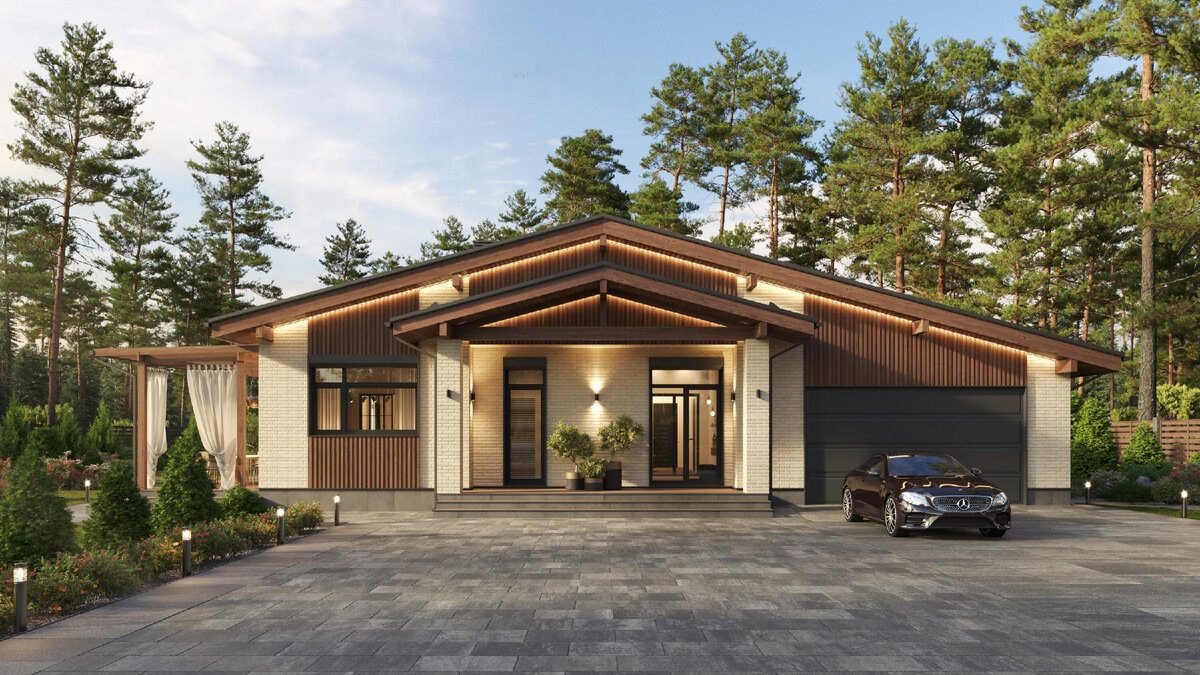 Дом в Чистопрудном современный одноэтажный дом. Построен из керамического блока Porotherm 440, внутренние стены выполнены из полнотелого кирпича, утепленная кровля с покрытием из Фальца. Все помещения дома расположены на одном уровне, что упрощает доступ в любую комнату, в том числе для взрослых членов семьи или маленьких детей. Центральное место дома — это красивая и просторная гостиная, объединенная с кухонной зоной, с помощью современного портала со стеклянными перегородками. В раздвинутом виде перегородки создают иллюзию простора; в закрытом состоянии они выполняют функции двери, изолируя лишние шумы и запахи во время приготовления пищи. В гостиной с помощью камина создается уютная и комфортная атмосфера для вечеров вдвоем или проведения вечеринок с друзьями. Над гостиной в кровле есть три мансардных окна, позволяющие максимально использовать естественный свет. В доме предусмотрены: · Мастер-спальня с гардеробной комнатой и своим санузлом, гостевая спальня и две полноценные детск