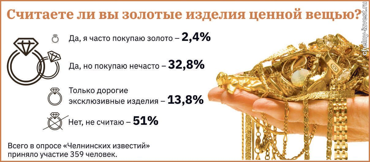 Раньше золото считалось ценностью номер один. Изделия были семейной реликвией: хранились бережно в шкатулках и передавались по наследству. Какова ситуация сейчас? Компенсация ущерба от неудачных отношений У многих челнинцев золотые украшения хранятся дома как память о первой потраченной зарплате или, например, подарок родителей к совершеннолетию. "Что бы ни говорили, я ношу золотые кольца, серьги и цепочки каждый день, так ощущаю себя самодостаточной и состоятельной, – сообщила 45-летняя сотрудница частной компании Зария Сибгатова. – Любовь к украшениям – от родителей, которые вкладывали деньги в золото и учили меня, что это вклад на черный день". Другие в молодости увлекались дорогими изделиями, стояли в очереди в день поступления их в магазины или переплачивали, приобретая с рук на рынках. В итоге, спустя годы, этот золотой товар продали как лом, в ювелирный магазин. "Несколько лет назад мы с мужем собрали свои золотые изделия и сдали в ювелирный магазин, – рассказала педагог Наталья