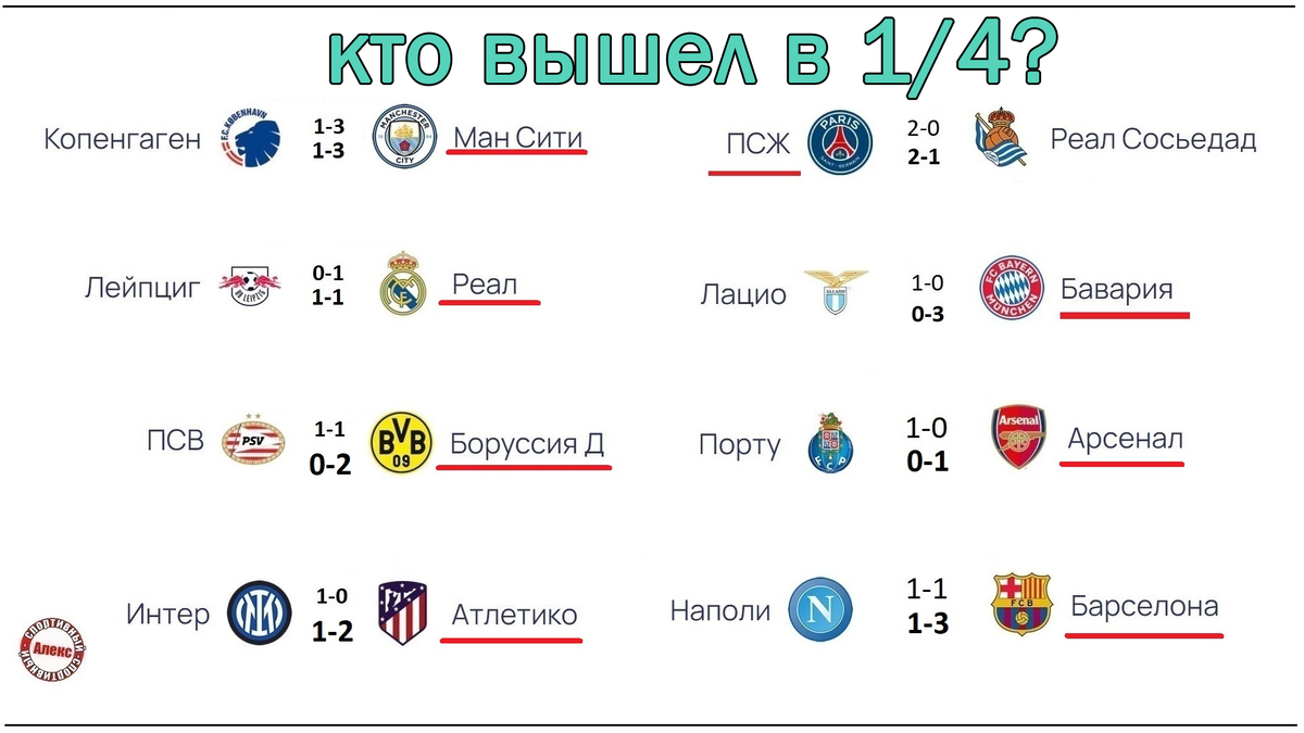 Привет, друзья! Сегодня во вселенной футбола состоялось грандиозное событие, сравнимое с недавним вручением «Оскара». На канале нашего спонсора был полный разбор всех номинаций и наград. Ссылка будет внизу. А мы сегодня смотрим результаты жеребьёвки ¼ Лиги Чемпионов УЕФА. И кроме этого ещё расскажу, кто может встретится в полуфиналах. Начинаем с участников. Кто пробился в четвертьфинал? Не знаю, как вы считали, но для меня всё предсказуемо. Получается борьбу за Кубок Чемпионов продолжают: 3 испанских представителя, 2 английские команды, 2 немецких клуба, и один французский гранд. С участниками познакомились. Переходим к результатам жеребьёвки ¼ финала. Арсеналу достаётся Бавария Мюнхен. Последнюю очную официальную встречу команды провели в этом турнире 7 лет назад. Немцы выиграли обе встречи по 5:1. Атлетико Мадрид встретится с Боруссией Дортмунд. Напомню, 6 лет назад команды встречались в одной группе и обменялись победами. Реал Мадрид вновь сразится с Манчестером Сити и попробует взя