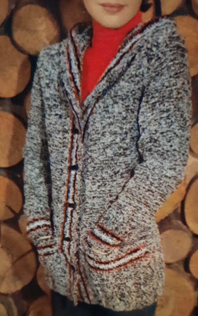 ЖАКЕТ С КАПЮШОНОМ. (Размер 44-46). Шерсть: 1100гр.(буклированная пряжа). Спицы 4. Вязание платочное(все ряды - лиц.п.)Карманы - резинка 3×3,манжеты и планка - застежка --- рез.2×2. Ширина цв.полос на отдел.планках: по 2р.красная полоса,черная,буклиров.и белая, затем ритм полос повторяется в обратном порядке, начиная с буклированной.