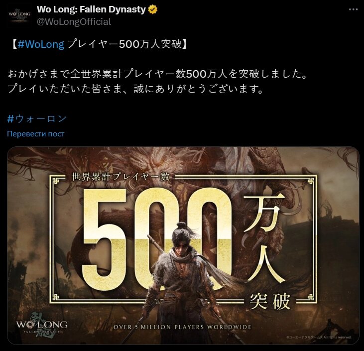 Издательство Koei Tecmo и разработчики из Team Ninja сообщили о том, что в их экшен-RPG Wo Long: Fallen Dynasty сыграло более 5 миллионов человек со всего мира. Данный анонс был опубликован в официальных социальных сетях игры. Напомним, что экшен-RPG Wo Long: Fallen Dynasty доступна прямо сейчас на персональных компьютерах, PlayStation 4, PlayStation 5, Xbox One и Xbox Series X/S по всему миру. Также доступно и "Полное издание" игры, которое включает в себя не только саму базовую игру, но еще и три контентных дополнения, которые выходили после релиза проекта. В данный момент у нас нет никакой информации о вероятности разработки продолжения для Wo Long: Fallen Dynasty.