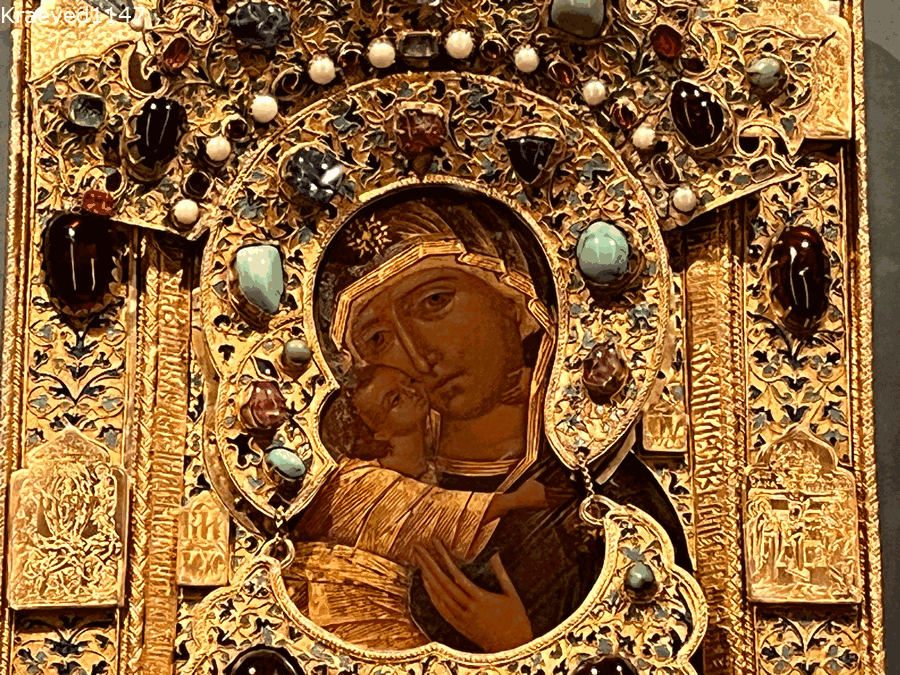 На выставке "Любители родной истории" в Московском Кремле представлена удивительная икона Владимирской Божией Матери в окладе. Выполнена она в конце XVI века в мастерских Московского Кремля.