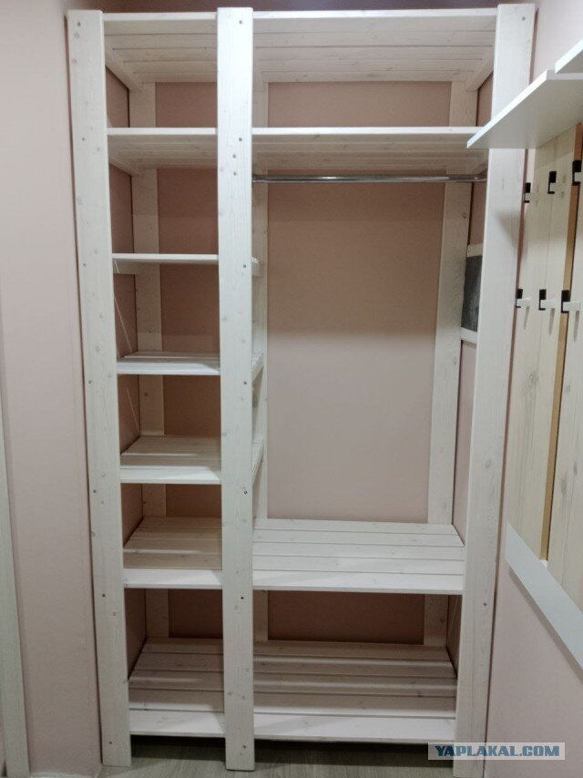 Регулярно просматриваю здесь посты местных рукоделов. В моей квартире тоже много разных элементов мебели и интерьера, сделанных своими руками. Но раньше особо процесс изготовления не фиксировал, а просто делал для себя. В этот раз решил это дело отфоткать и поделиться. 17 фото 1. Началось всё с ремонта в прихожей, пока семьи не было дома. 2. Для финишной отделки выбрал окраску стен. Результатом остался довольны все члены семьи. Раньше в этой нише у меня просто была временно (на самом деле 6 лет с ней прожили) смонтирована труба от стены до стены, на которую вешали верхнюю одежду на вешалках, но мест для всяких шапок, шарфов, зонтиков и коробок с обувью на разные сезоны не было совсем. Вдоль стены же стоял лоток для обуви, обувница, пуфик и настенные вешалки с полочками. 3. На Pinterest нашёл что-то похожее, что я представлял себе в своей прихожей, сделанное из деревяшек и металла. Дальше выполнил все замеры проёма, прикинул высоты полок, самого шкафа, уровень перекладины и нарисовал че