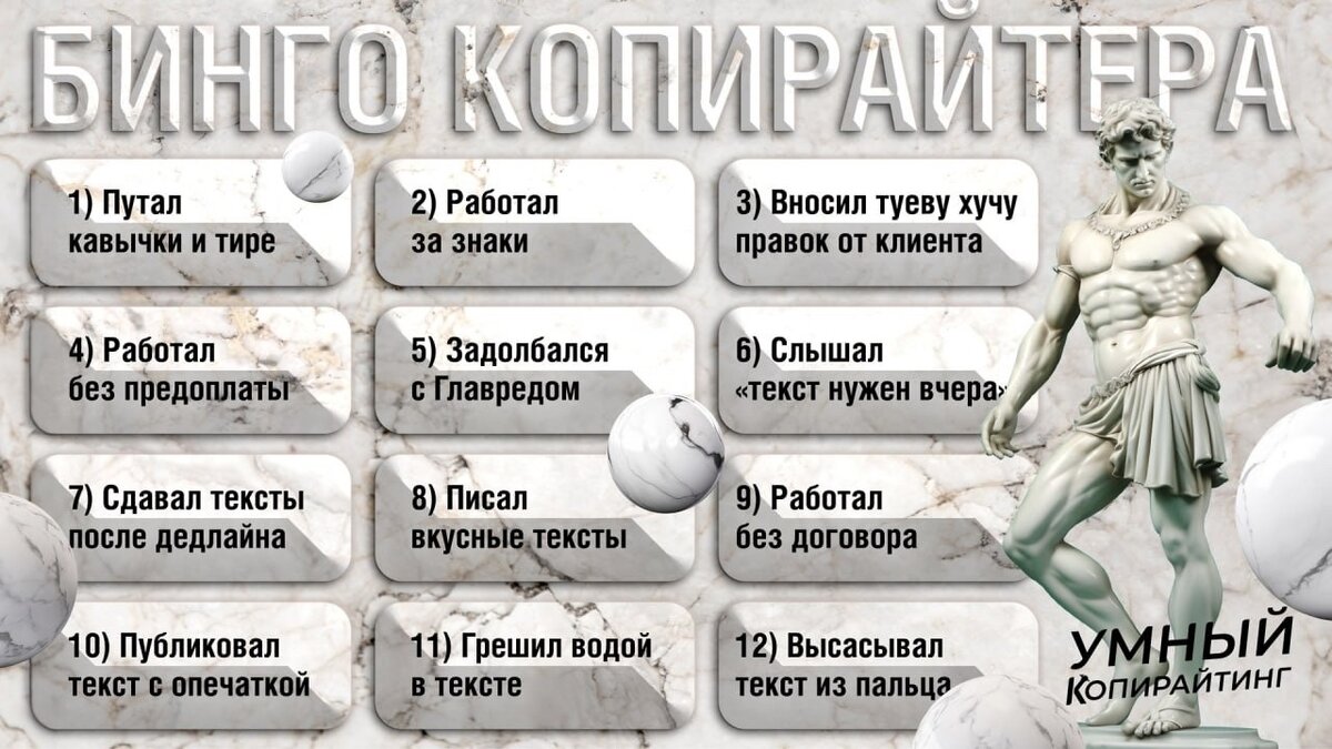 Привет, друзья! Пишите в комментариях, что из этого бинго копирайтера точно у вас было? Кто собрал всё? :)