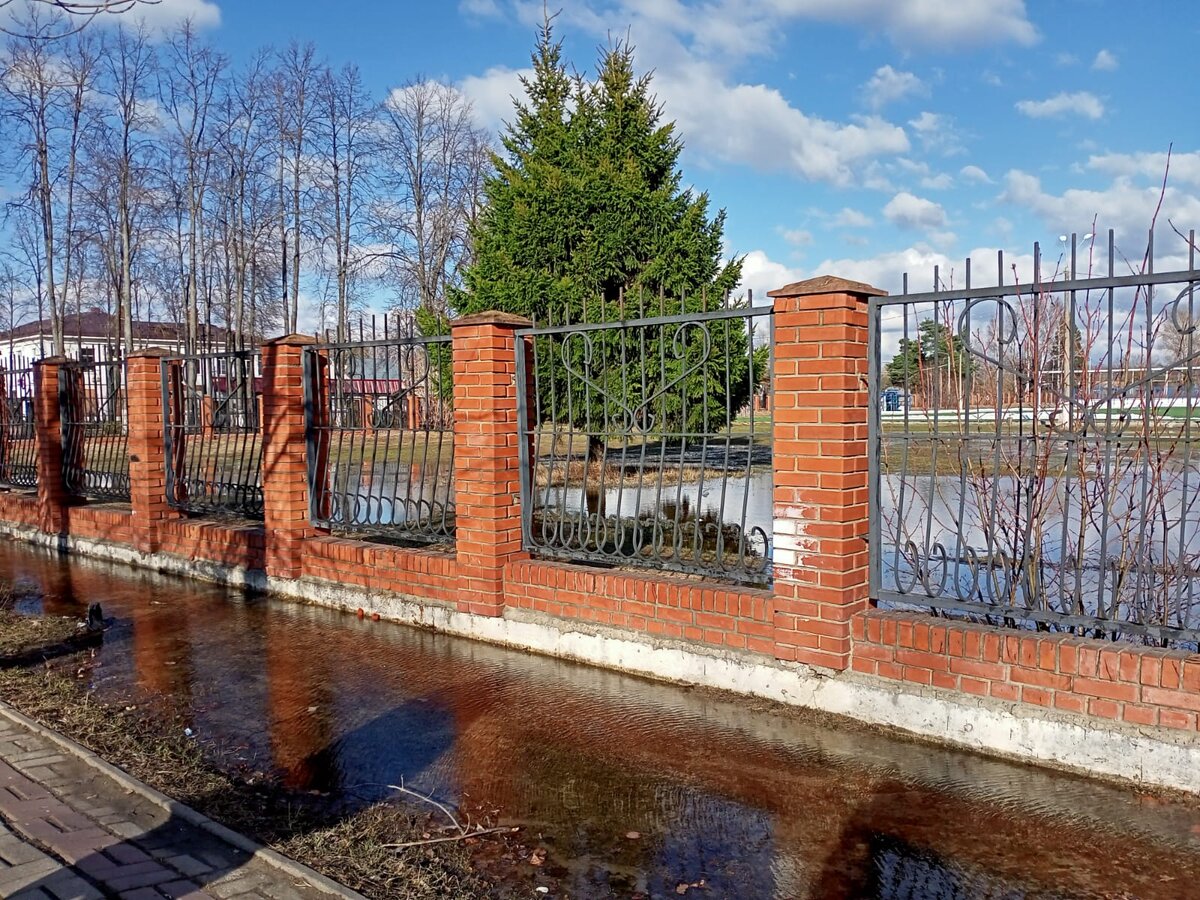 Нашла такую лужу. За забором она не сильно видно. Но тоже вытекает на дорогу. Никому не мешает. с ней ничего не делают. Ждут.