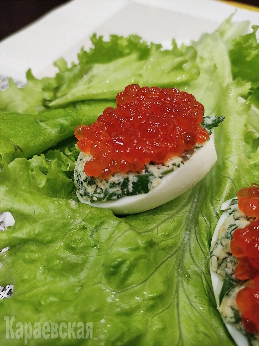 На листья салата выложить фаршированные яйца.