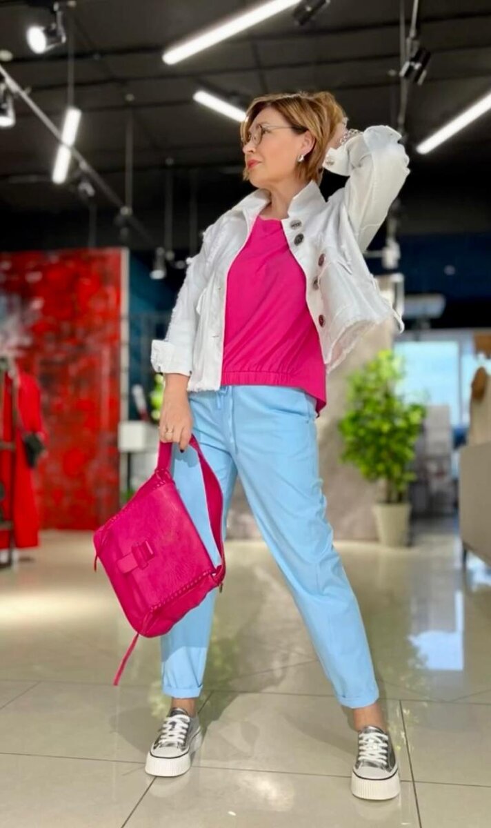 Голубые брючки, зауженные к низу с небольшими отворотами, яркая футболочка и белая джинсовая курточка.