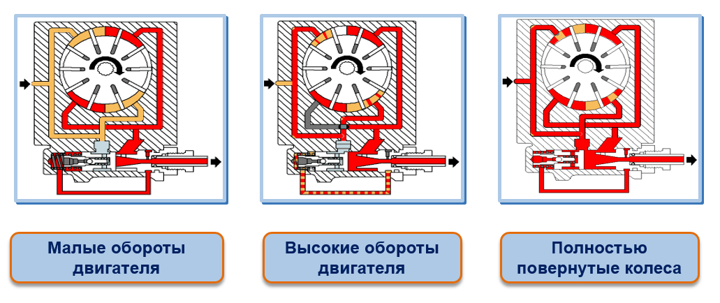 Шкив насоса закреплен на наружном конце вала, который установлен на подшипнике качения. Ротор посажен на шлицах на валу. В пазы ротора вставлены лопасти. Корпус гидронасоса представляет собой статор с крышкой и распределительным диском. В процессе вращения ротора лопасти захватывают рабочую жидкость. Затем под давлением подают эту жидкость через отверстия распределительного диска и канал в крышке насоса в клапан управления потоком, а далее в нагнетательный трубопровод. Особенность работы насоса ГУРа заключается в том, что его производительность напрямую зависит от оборотов двигателя. В то же время вся система гидроусилителя руля рассчитана на работу при постоянной производительности, а максимальное значение давления не должно превышать установленного. Поэтому насос выдает практически максимальное давление даже на холостых оборотах двигателя, а для того, чтобы его значение не превышало допустимого, в нем установлен клапан управления потоком жидкости. Фактически, это редукционный клапан, который сохраняет давление в системе постоянным при увеличении числа оборотов коленчатого вала. Он представляет собой гидравлический дроссель, который работает автоматически. Впоследствии конструкция данного клапана была модернизирована. В нее добавился специальный золотник, ограничивающий производительность насоса. Это позволило добиться регулирования усилия на руле в зависимости от скорости движения автомобиля.