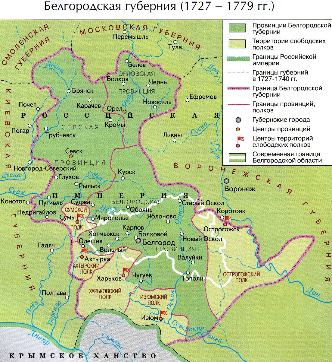 Про племена аланов, хазаров и печенегов опустим. В 965 году земли в верховьях Северского донца были присоединены к Переяславскому княжеству Киевской Руси. Ордынское нашествие 13 века земли эти практически опустошило, за ними закрепилось название "дикое поле". Оживилось это поле после присоединения к Московскому княжеству, в основном заселялось тогда беглыми крестьянами и холопами. Основание Белгорода и Старого Оскола считают с 1596 года. На рубеже 16 и 17 веков, для охраны от набегов крымских татар, соорудили сплошную линию военных укреплений – Белгородскую оборонительную черту с центром в Белгороде. Возникла масса городов, которые впоследствии утратили роль укреплений и превратились в селения или совсем исчезли. В 1708—1727 годах территория современной Белгородской области входила в Киевскую и Азовскую губернии. В 1727 была образована Белгородская губерния, включавшая территории нынешних Курской, Орловской, частично Брянской и Харьковской областей. Но в 1775-79 была упразднена, соврем