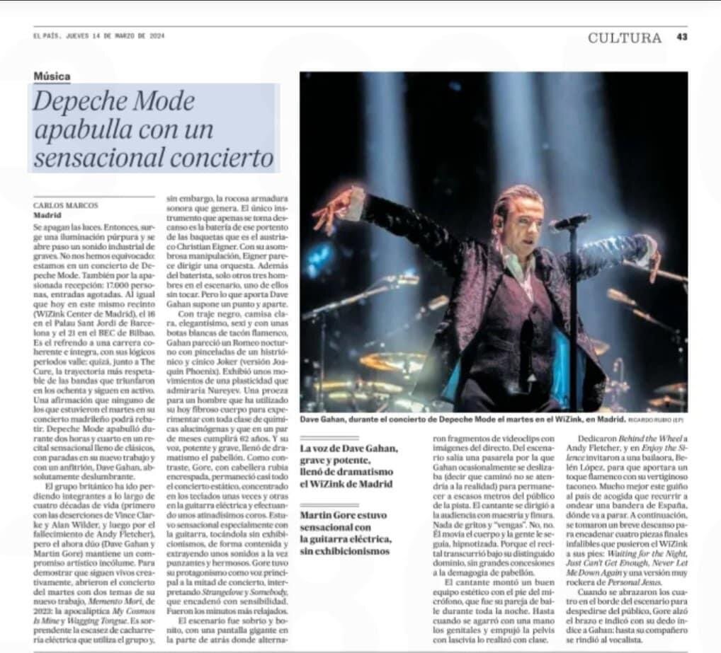 ✅Оригинальный заголовок: Depeche Mode apabulla con un sensacional concierto ✅Перевод: BlackPimpf ✅Текст: КАРЛОС МАРКОС, Мадрид Гаснет свет. Затем загорается фиолетовое освещение и раздается индустриальный скрежет. Мы не ошиблись - мы на концерте Depeche Mode. Зал страстно принял 17000 человек и все билеты распроданы. По аналогии, как и сегодня здесь, в Мадриде (центр WiZink), 16-го числа шоу состоится во Дворце Сант-Жорди в Барселоне и 21-го числа в HEC в Бильбао. Все это является результатом последовательной и комплексной карьеры и выстроенной логистической цепочкой, как, к примеру и у The Cure, да и рядом самых успешных и респектабельных групп, одержавших победу в восьмидесятых и действующих до сих пор. Depeche Mode на протяжении двух с четвертью часов ошеломляли сенсационным концертом, полным классического материала, с остановками на новых работах и совершенно потрясающим фронтменом Дэйвом Гааном. Это заявление не смогут опровергнуть те, кто был на мадридском концерте Depeche