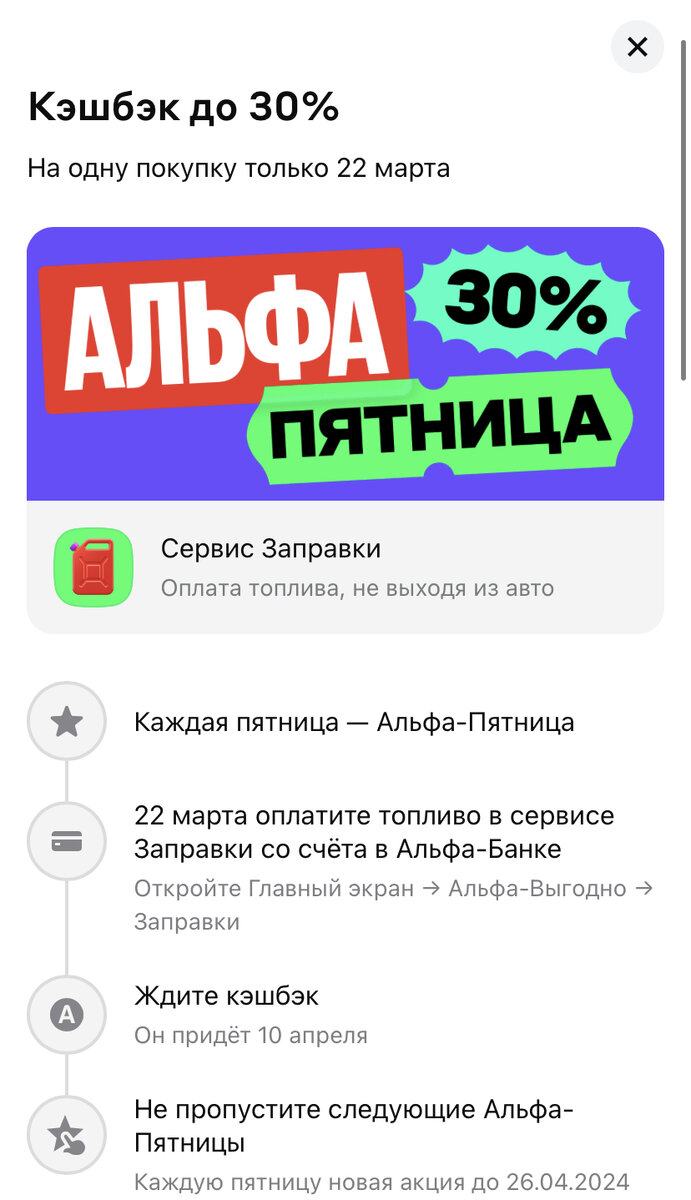 Каждую пятницу до 26.04.2024 у Альфа банка супер кэшбек (каждый раз новый) И 22 марта пятница при заправке любого топлива (один раз) через приложение банка и при оплате их картой - кэшбек 30% ❗️❗️🔥 Максимум 500 руб ❗️ 🤩 А если у вас еще нет карты Альфа банка, советуем оформить, у них очень много скидок, например даже 100% кэш, или 5% кэшбека на продукты, 5% на коммунальные услуги❤️🔥 А если оформите карту по этой ссылке, то вам вернется с первой покупки 500 рублей 😉 При этом, обслуживание карты бесплатно навсегда и переводы по карте будут без комиссии в любые банки! Реклама АО «Альфа банк»