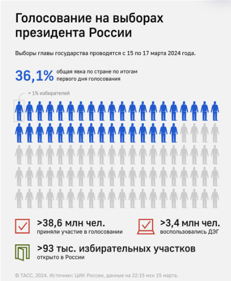 Выборы президента. Наблюдатели не отметили серьезных нарушений Наблюдатели, как иностранные, так и российские, не сообщали о каких-либо серьезных нарушениях. Как заметил глава миссии наблюдателей Шанхайской организации сотрудничества, ее генеральный секретарь Чжан Мин, "никаких вопросов и проблем" не замечено. Однако на некоторых участках не обошлось без инцидентов - там пытались испортить урны и бюллетени зеленкой и другими жидкостями, было зафиксировано несколько попыток устроить поджог. Как указала на брифинге в информационном центре председатель Центризбиркома Элла Памфилова, за такие деяния грозит уголовная ответственность - вплоть до пяти лет лишения свободы. В ЦИК при этом заверили, что эти инциденты единичны и на самих выборах никак не отразятся. По последним данным Центризбиркома РФ, общая очная явка составила 36,12%, причем в некоторых регионах, в том числе ДНР, Херсонской области и на Чукотке, она превысила 60%. Россияне также очень активно голосуют электронно. На федерально