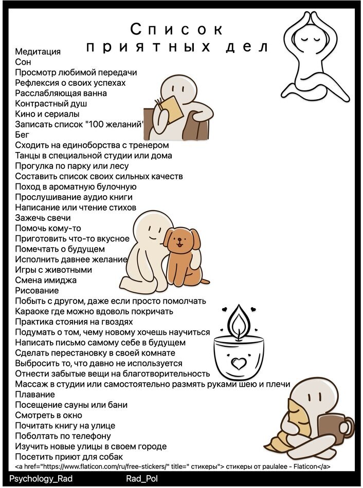 Предлагаю рассмотреть небольшой список приятных дел, способных на время снизить негативные эмоции. Делитесь своими вариантами в комментариях и возможно именно ваш вариант поможет тому, кто будет в этом нуждаться!