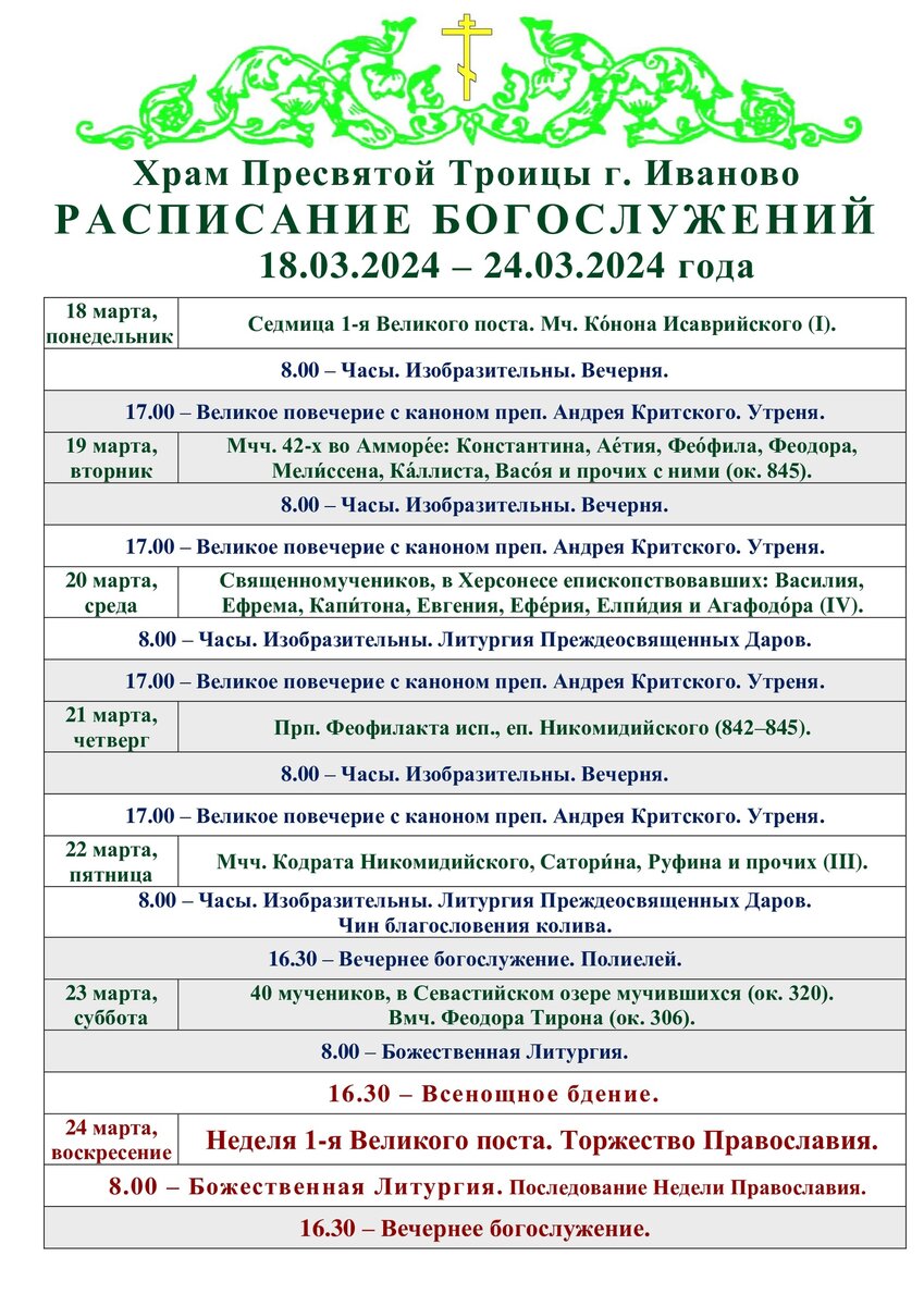 18-24.03. Расписание богослужений в Троицком храме города Иваново