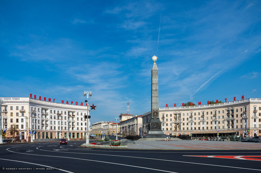 На площади Победы в доме, который все знают по словам "Подвиг народа", продается хорошая квартира. В ней четыре комнаты, светлые стены и вид из окна прямо на Вечный огонь. Смотрим. Это дом по адресу Независимости, 37. Тот самый, на котором надпись «Подвиг народа». Из окон открывается вид на площадь Победы, а вдалеке из окна виднеется колесо обозрения. В этой квартире четыре комнаты, общая площадь — 81 квадрат, жилая — 62 квадрата. Кухня занимает 6 метров. Но несмотря на небольшой размер, по фотографиям комната кажется удобной и удачно распланированной. Дополнительную рабочую поверхность добавляет барная стойка. Из кухонного окна открывается вид на площадь Победы и сталинку, в которой расположен магазин «Щедрый». Площадь двух жилых комнат — около 13 квадратов, еще две занимают около 18. Вот как выглядит планировка. В квартире трехметровые потолки, на полу лежит паркет, а стены выкрашены в белый цвет. В гостиной стоит стол, на стене телевизор. В спальнях несколько спальных и рабочих мест
