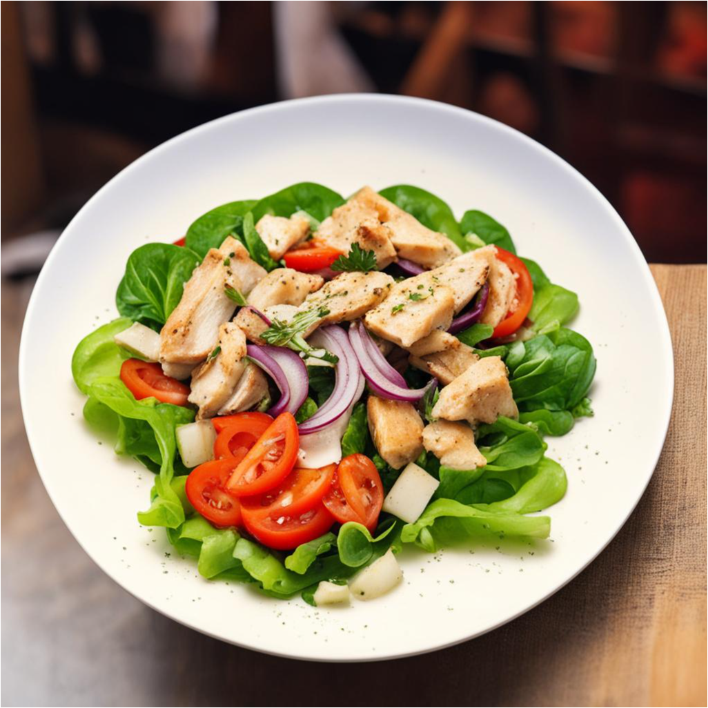 Ингредиенты: Куриное филе, помидоры, огурцы, сладкий перец, лук, зелень, оливковое масло, соль, перец.