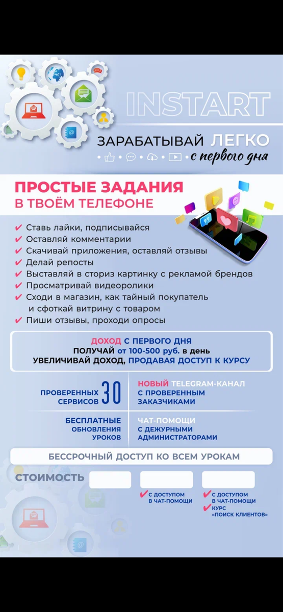 Самый простой и быстрый вариант для старта- заработок на выполнении простых заданий!  Зарабатывать можно от 10000 до 30000 тысяч рублей  Суть работы заключается в выполнении заданий (задания по типу): ✅скачать приложение ✅написать комментарий  ✅подписаться на канал/профиль  ✅пройти опрос  ✅перепечатать текст ✅оставить отзыв  ✅сделать звонок как тайный покупатель  ✅перевести аудио в текст т.д количество заданий в день не ограничено. обучения никакого не требуется, ты с первого дня сразу сможешь начать зарабатывать✨ работаешь когда хочешь, и где хочешь) Для работы нужен только телефон 📱  Пиши в комментарии ( хочу курс) и я вышлю ссылку на курс с проверенными сайтами для заработка